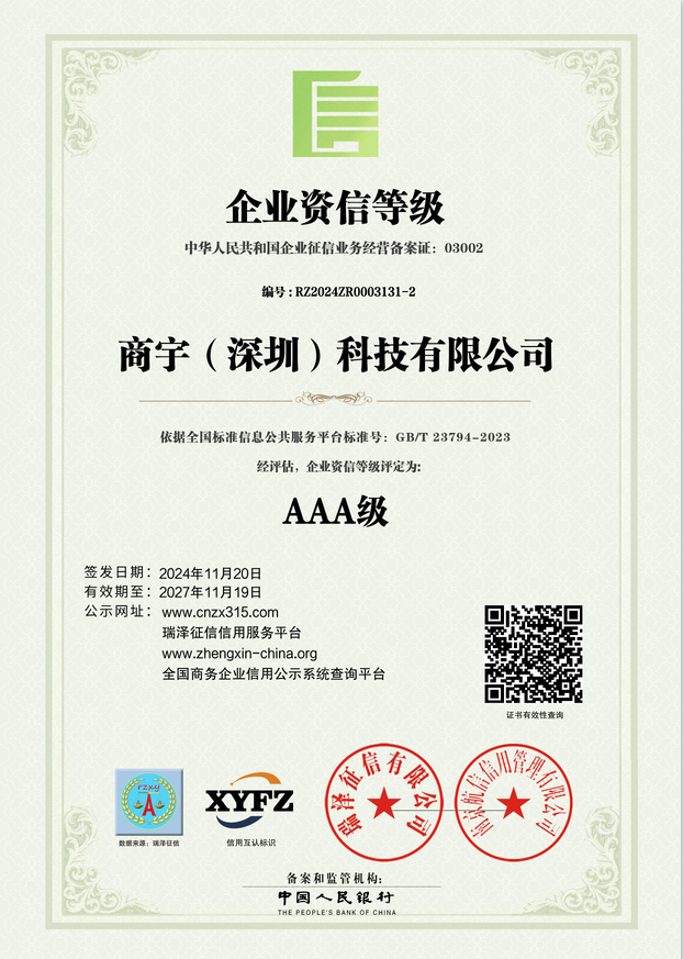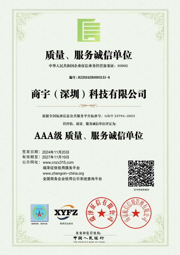 商宇公司日前获得了“国内质量、服务、信誉AAA级企业”荣誉称号,这是市场对商宇公司的再次肯定。此外,凭借其在产品质量、售后服务等方面的突出表现,商宇公司还连续获得国内质量检验协会颁发的“国内产品和服务质量诚信示范企业”、“国内电器设备行业质量领先品牌”、“国内质量检验稳定合格产品”等三项荣誉证书。